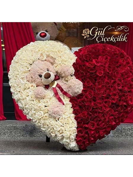 Yarım kalp formunda beyaz güller ve kırmızı güllerin birleşimi, “iki kalp tek aşk” konseptini simgeler. Ortasında yer alan peluş ayıcık ise hediyenize sıcak ve duygusal bir dokunuş katar.
