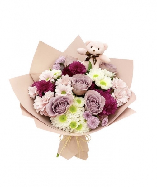 Kırmızı Gül, Beyaz Karanfil ve Mor Orkide Aranjmanı